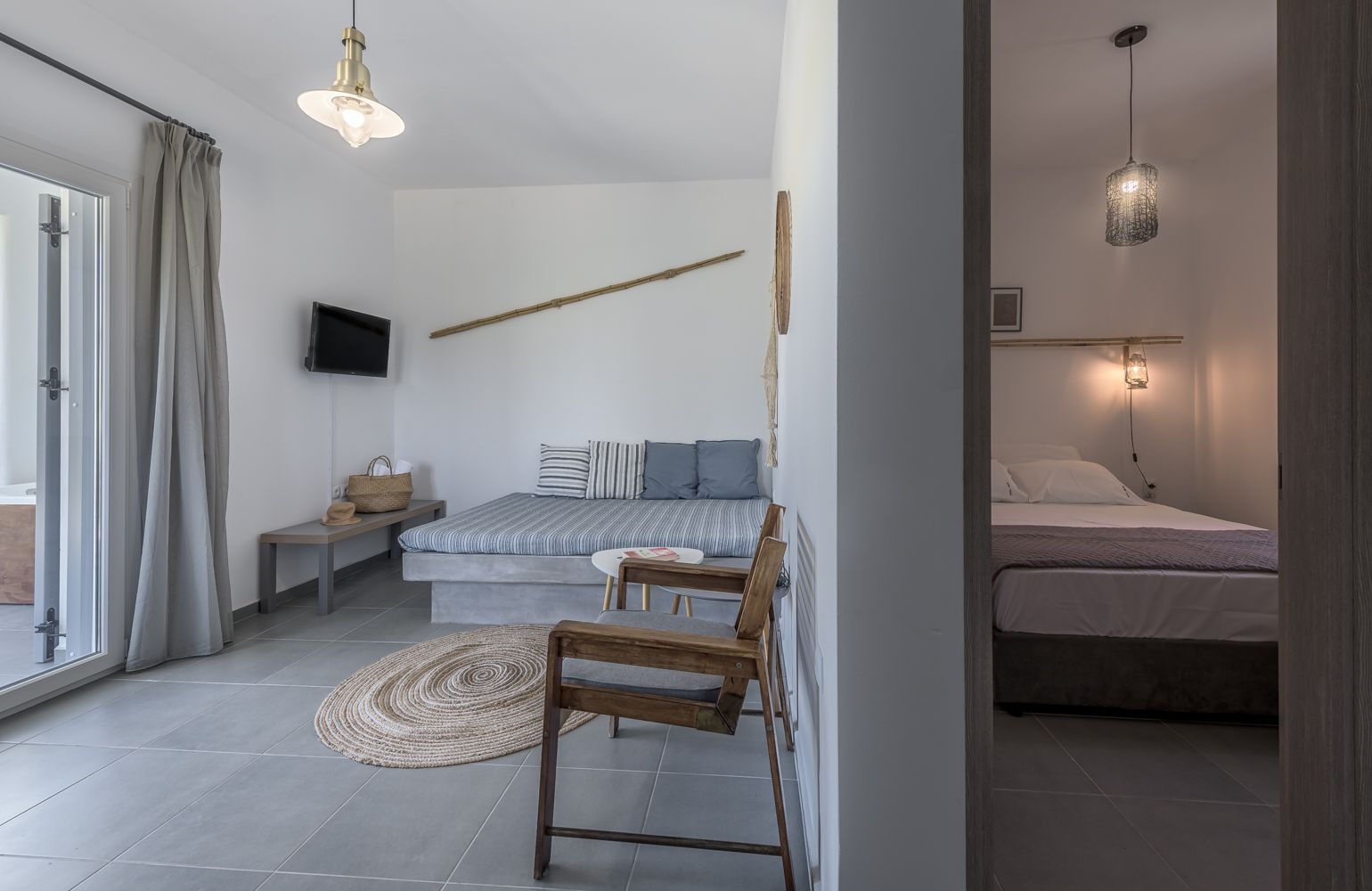Per il vostro comfort, ogni monolocale è dotato di un climatizzatore a risparmio energetico, una Smart TV da 32’’ con accesso a Internet e Netflix, oltre al Wi‑Fi gratuito. Ogni monolocale dispone inoltre di un letto matrimoniale con materasso di alta qualità e biancheria premium, oltre a un divano in muratura che può essere utilizzato anche come letto singolo, il tutto decorato in stile Cicladico minimalista.